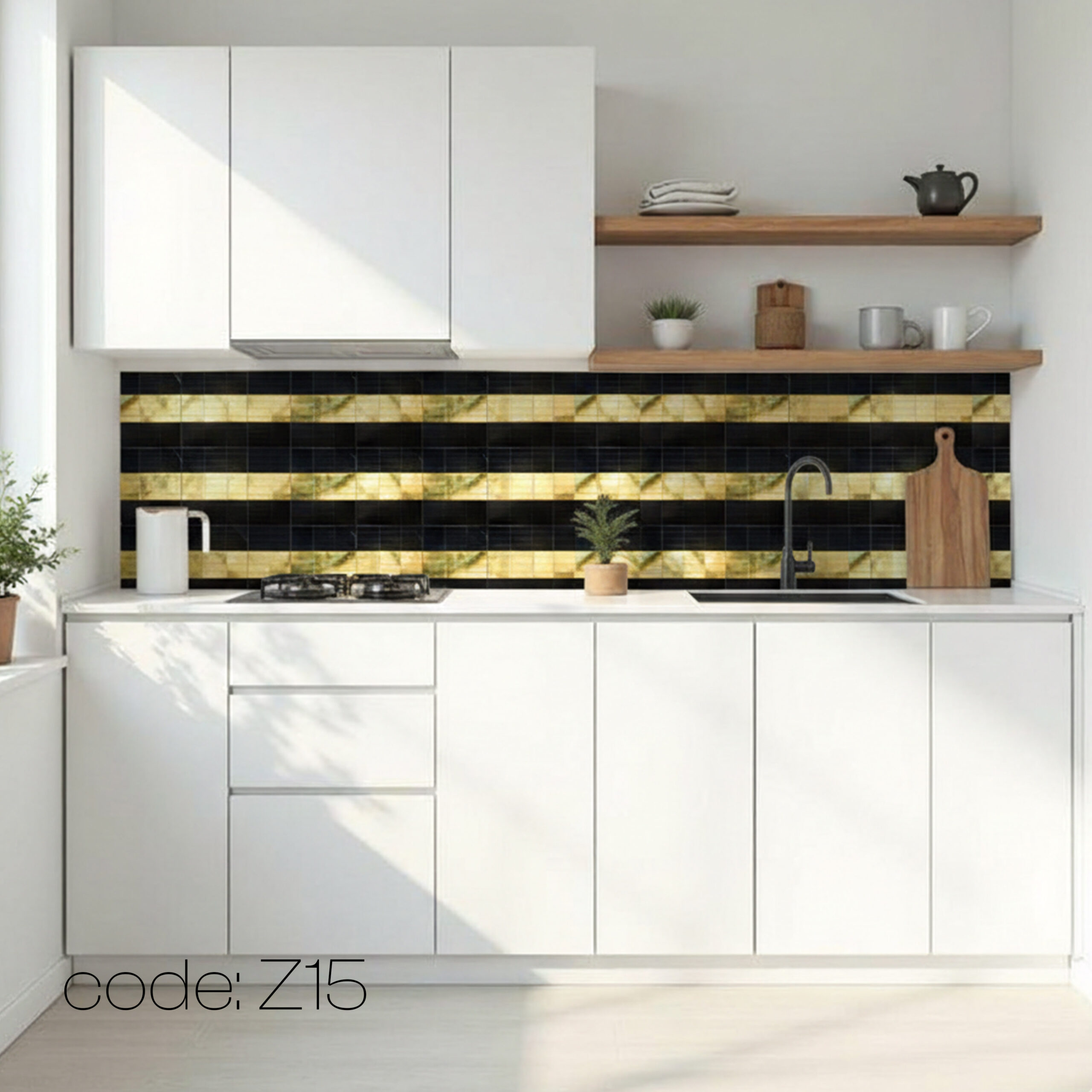 امروزه فضای بین کابینت در آشپزخانه ها از مهمترین قسمت های هر خانه به شمار می رود که استفاده از تایل های آلومینیومی پشت چسب دار به دلیل تنوع طرح و سهولت نصب بسیار مورد توجه قرار گرفته است. نصب این محصول آسان بوده و برای اجرای آن نیاز به تخصص خاصی نیست و کافی است روکش پشت تایل ها را جدا نموده و آن ها را بر روی سطح بچسبانید و در صورت نیاز، برش آن توسط کاتر یا مینی سنگ انجام می شود. این محصول مناسب جهت اجراء بر روی انواع سطوح صاف از جمله کاشی، سرامیک، سنگ، دیوار رنگ شده، شیشه، ام دی اف و سایر سطوح مسطح می باشد. در صورت نیاز به اجراء بر روی دیوار گچی (دیوار سفید کاری شده) ابتدا می بایست دو دست آستر الیف و یا چسب چوب رقیق شده روی گچ خام اعمال شده و پس از خشک شدن اجراء گردد. این محصول تا حرارت 80 درجه سانتی گراد نیز مقاوم است.